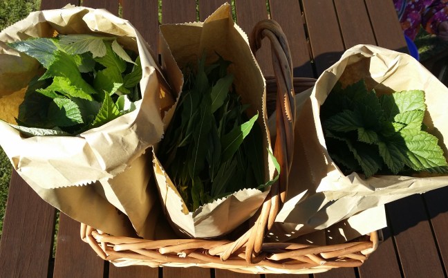 Tein eilen korin kanssa noin tunnin mittaisen iltakävelyn lähimetsän poluille ja hakkuuaukeille. Saaliiksi tuli iso kasa vadelman ja maitohorsman lehtiä. Kotipihalta nappasin mukaan vielä mustaherukan lehtiä. Nämä kaikki ovat sellaisia, joita kuivatan yleensä isot määrät talven varalle, koska ne ovat erinomaisia yrttiteeaineksia, ja hyödynnettävissä myös mm. viherjauheisiin. Halutessaan yrttiteeainekset voi yhdistää myös tavallisen teen kanssa eli nauttia vaikka vihreän teen osana.